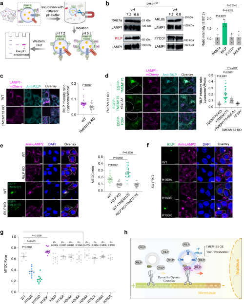 研究团队利用这一工具,发现溶酶体外侧持续包裹着一层厚约20纳米的氢离子层,并揭示了酸性纳米层的维持依赖于溶酶体膜上的氢离子通道蛋白TMEM175。团队进一步发现,溶酶体表面的pH值是调控其在细胞内的运动与空间分布的关键信号。同时,团队鉴定了细胞质中的RILP蛋白作为下游氢离子感应器,能够感知溶酶体表面的酸性变化,进而引导溶酶体向细胞核方向移动,并启动相关生理功能。