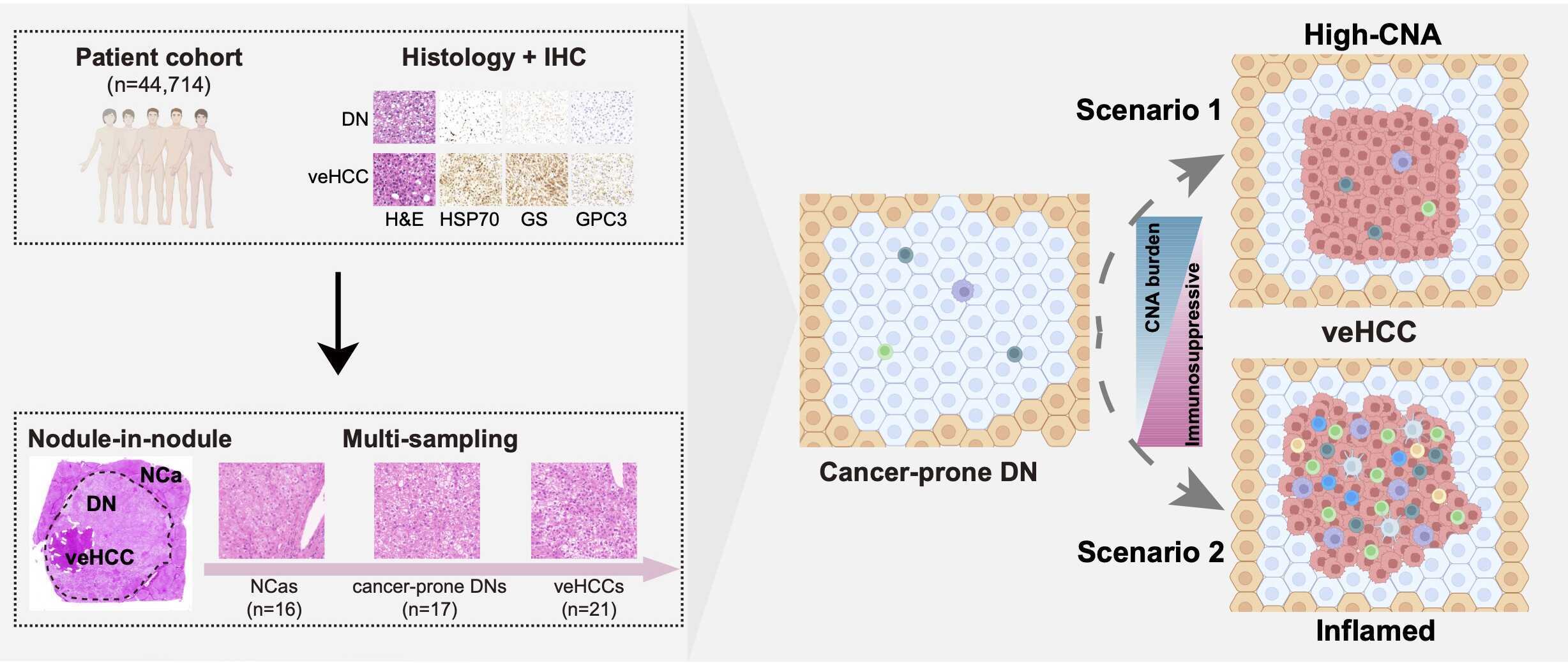 团队针对高危不典型增生结节及其内部的极早期肝细胞癌,开展了基因组与免疫图谱全景分析。