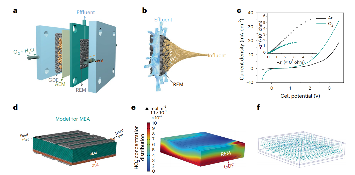 针对这一问题,研究团队创新性地将气体扩散电极与电化学活性膜电极相结合,组装了膜电极组件(MEA)水处理系统,实现了阴极氧还原反应和阳极氧化反应的耦合增效。中国科学院上海高等研究院的研究团队在本工作中,特别是在理论计算与模拟方面提供了关键支撑。通过多物理场模拟,清晰揭示了MEA系统中电位分布、活性物质浓度场(如HO₂⁻和·OH)及流体压力场的变化规律,从理论上阐明了该装置相对于传统流动池反应器(FCR)在传质效率、反应动力学和电流密度方面的优越性,为器件设计与性能优化提供了重要理论依据。