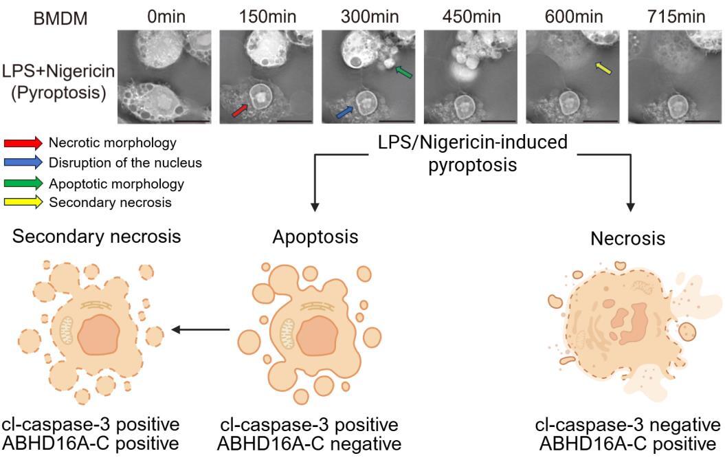 进一步利用识别坏死切割新生末端的抗体ABHD16A-C进行分析,研究人员在LPS/Nigericin诱导的细胞焦亡中观察到至少三类细胞:一类为caspase-3不激活但ABHD16A-C阳性的细胞,代表GSDMD介导的坏死样细胞;一类为caspase-3激活但ABHD16A-C阴性的细胞,代表凋亡细胞;还有一类同时具有两类标志,代表凋亡后的继发性坏死细胞。该结果说明,即使在单一刺激下,不同细胞也可能进入不同死亡轨道,而群体平均信号往往会将这些本质不同的过程混合在一起。