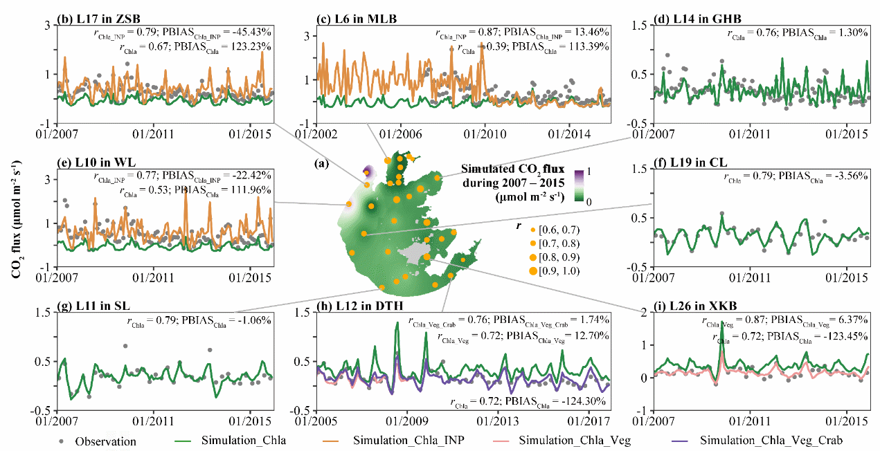 针对这一科学问题,中国科学院南京地理与湖泊研究所研究团队以太湖为研究对象(图1),改进了湖泊碳通量模拟模型“LAKE”的关键水环境参数(pH、叶绿素a)与CO2传输系数算法,并开发了“入湖河流碳输入、大型水生植被、河蟹养殖”等影响湖泊碳通量的过程模块,构建了一个适用于亚热带大型浅水湖泊的碳循环模拟模型(图2)。改进版LAKE模型精准刻画了太湖的碳循环过程(图3),成功复现了太湖水温、湖面叶绿素a浓度、CO2浓度、CO2通量和扩散甲烷(CH4)通量的季节和年际变化特征。
