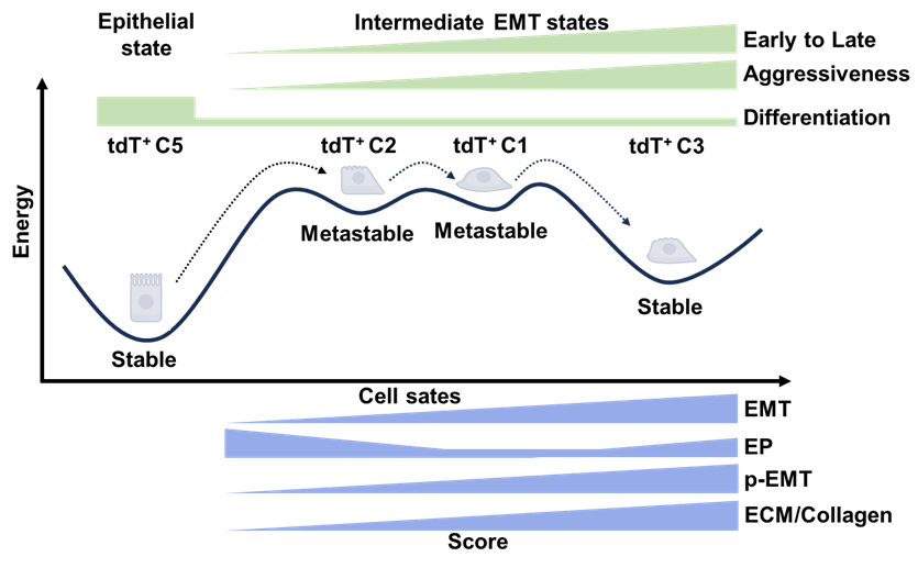研究团队利用由BRAFV600E突变驱动的成年发病型原位PTC小鼠模型以及单细胞RNA测序技术,探讨了恶性甲状腺肿瘤细胞的转录异质性和细胞层级结构,并鉴定出处于不同细胞状态的多个细胞亚群,这些亚群具有不同程度的稳定性和EMT特征,排列形成一条单一而非分叉的EMT演化轨迹。细胞沿该轨迹经历中间状态并最终转变为更具恶性的细胞状态。基于流式分选技术和类器官培养体系,研究团队获取了不同的恶性细胞亚群,并验证其功能异质性和细胞状态转换。此外,研究团队发现二甲双胍治疗可抑制PTC肿瘤发生,并减少最具恶性的细胞亚群。通过类器官培养,证明二甲双胍能够抑制EMT过程,提示其具有作为针对BRAFV600E突变驱动的PTC治疗干预手段的潜力。