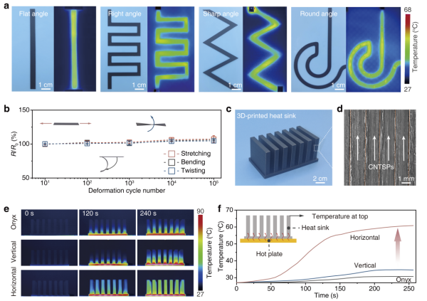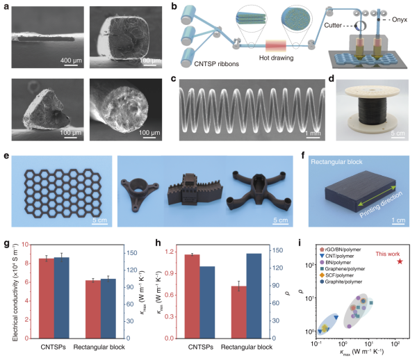 近日,中国科学院苏州纳米技术与纳米仿生研究所等开发出一种可规模化制备的原位碳纳米管—聚合物融合与热加工工艺,成功制备出兼具超高性能与优异加工性的碳纳米管超级塑料(CNTSP)。该材料实现了定向高热导、高强高导的特性,且可通过3D打印、热压成型制备成各类结构,为电子器件高效热管理提供了全新解决方案。