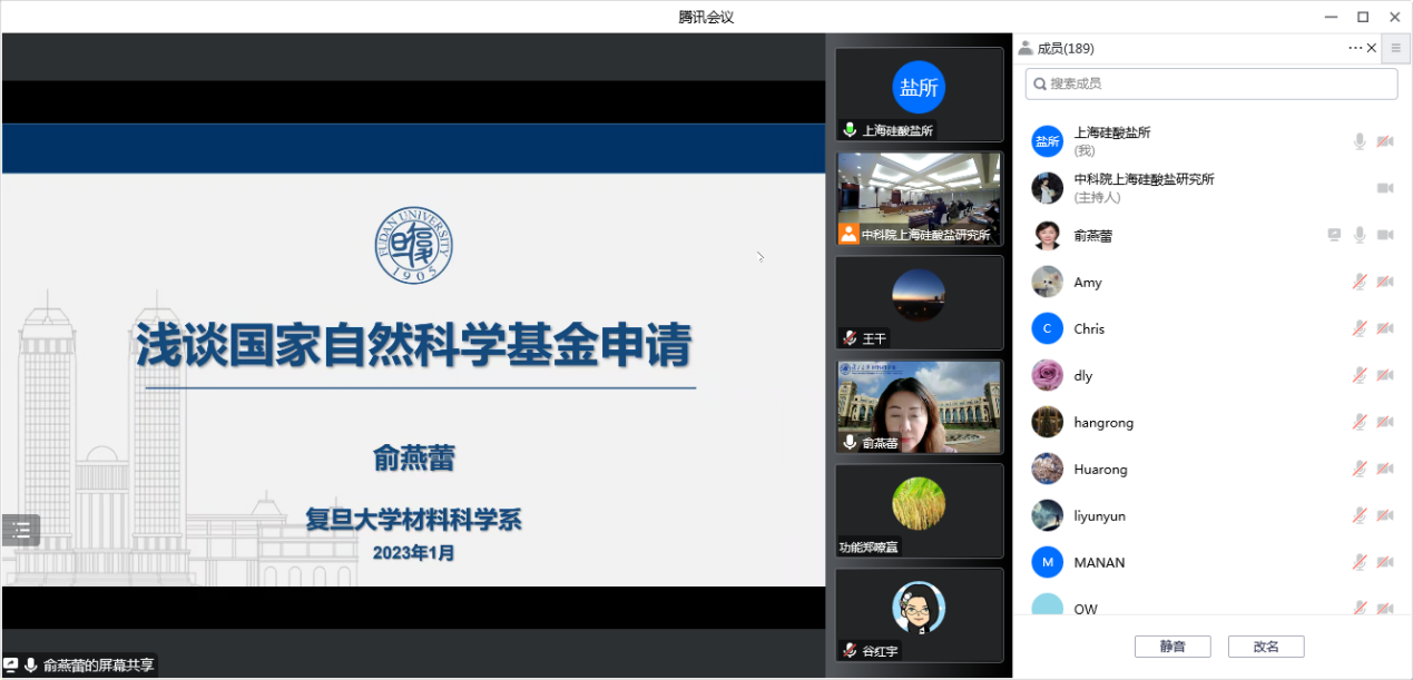 沈沪江作《国家自然科学基金2022年项目资助概况及2023年工作注意事项》的报告,介绍了国家自然科学基金相关情况、研究所改革具体举措以及2023年申请工作总体安排。上海硅酸盐所涂层中心主任于云、测试中心副主任钱荣、青年科研骨干邓瑞翔等分享了2022年申报基金项目的经验和体会。与会人员就青年和重点项目申请等方面展开了深入的交流和讨论。