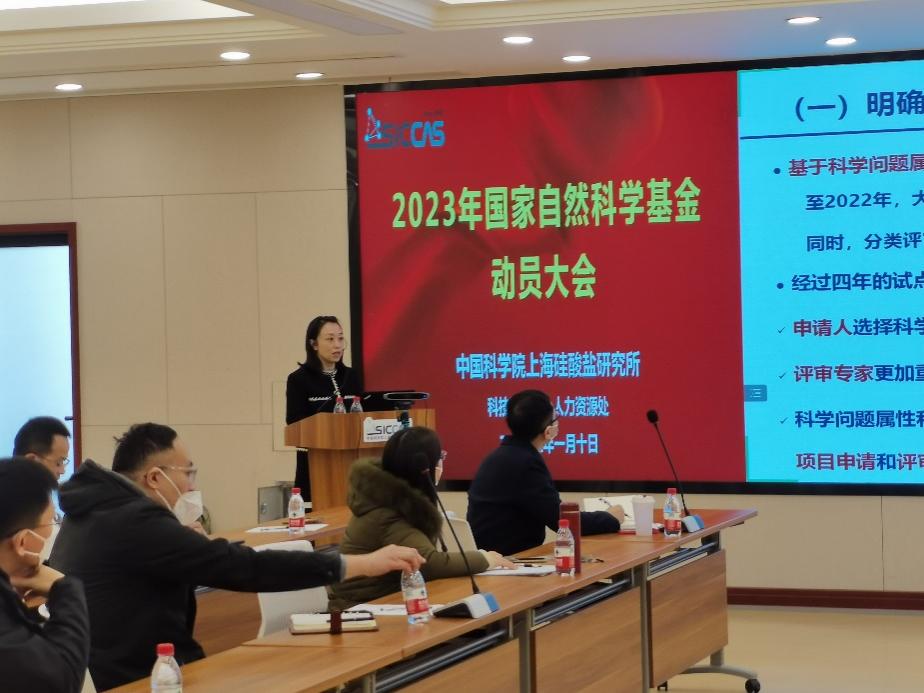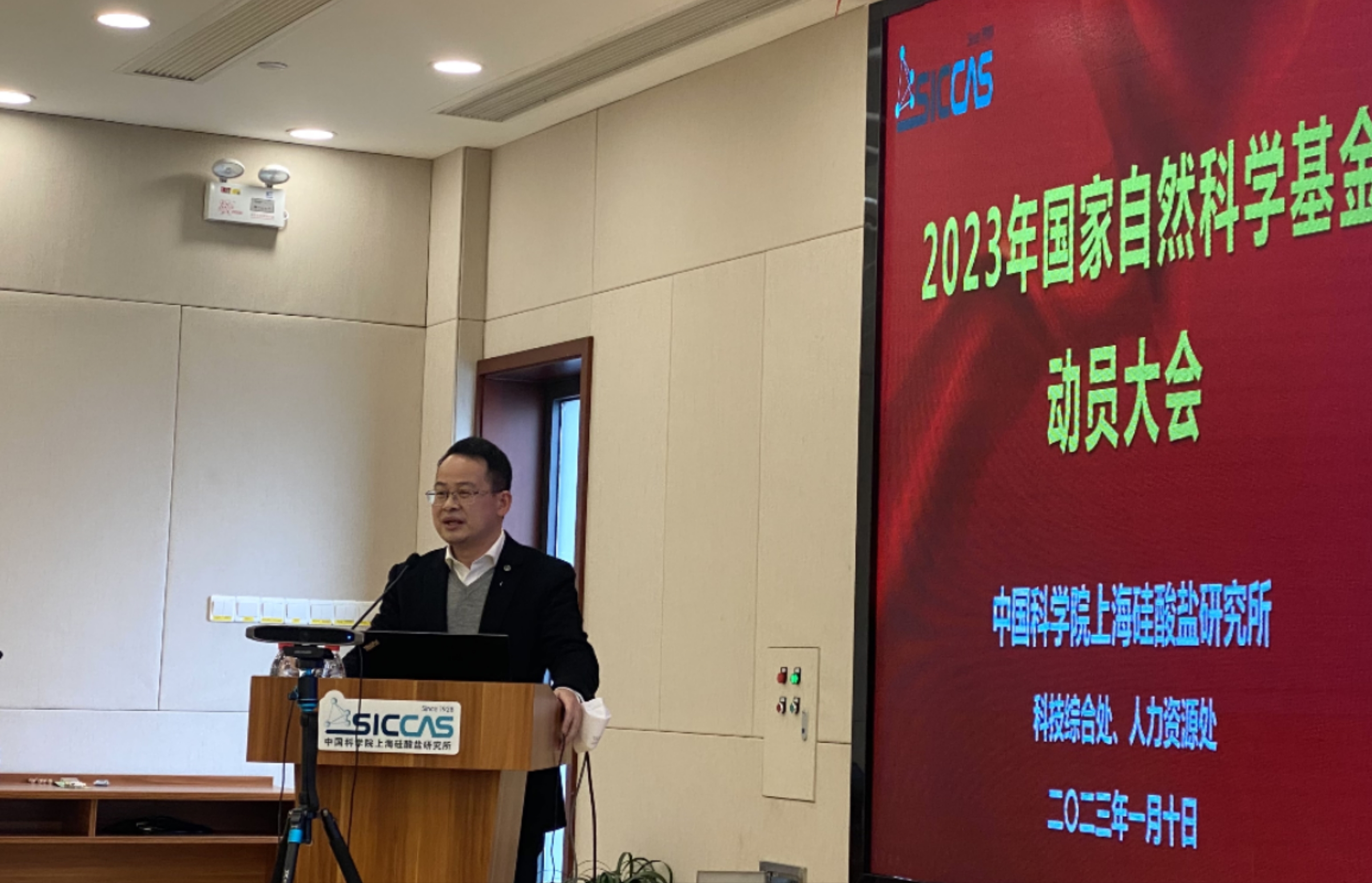 为落实中国科学院加强基础研究工作会议精神,做好2023年度国家自然科学基金项目申报工作,1月10日上午,中国科学院上海硅酸盐研究所以线上线下结合方式召开2023年度国家自然科学基金申报动员会。上海硅酸盐所所长宋力昕,副所长吴成铁,科技综合处处长刘军、副处长沈沪江,研究所280余名科研人员等参加了会议。会议由刘军主持。