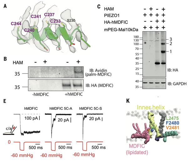 图4. MDFIC的脂质化修饰参与Piezo门控调节