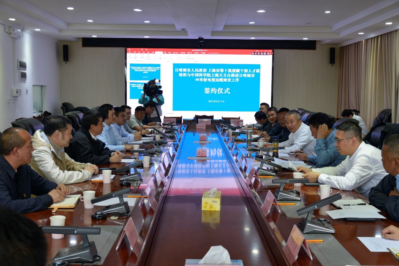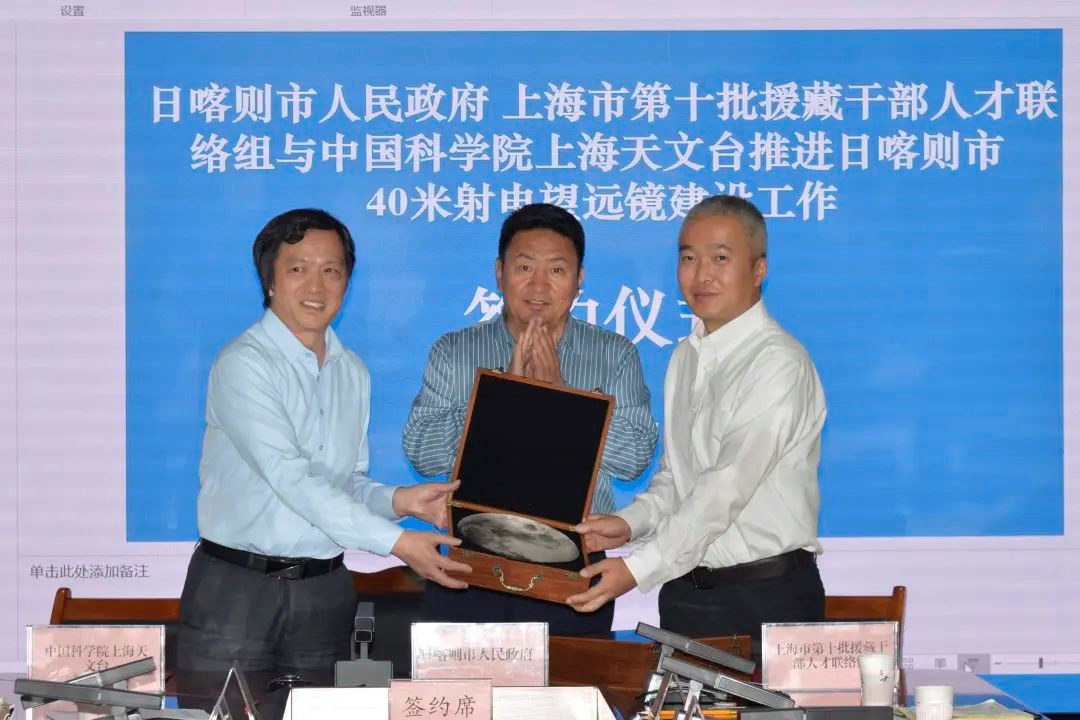 8 月 17 日下午,上海天文台、日喀则市人民政府、上海市第十批援藏干部人才联络组签订“关于建设中国科学院上海天文台西藏日喀则观测站的合作备忘录”并召开项目协调会,上海市科学技术委员会、西藏自治区科学技术厅相关代表参加会议。