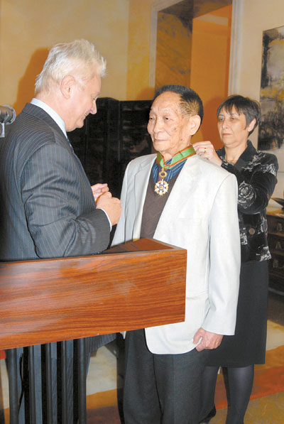 袁隆平院士今天穿了一件白色的西装,显得格外精神矍铄,夫人邓则穿了一件大红的唐装,亦是喜气洋洋。袁院士胸佩这一代表法国国家级荣誉的勋章,在法国驻华大使官邸发表了简短的获奖感言。他说,荣誉对我是一种精神鼓励,鼓励我要继续努力前行。科学无国界,杂交水稻成果不仅属于中国,而且属于全世界。目前,世界上水稻面积为15亿公顷,平均产量仅有4吨/公顷,如果每年在一半的水稻种植面积上改种杂交稻,按每公顷增产2吨稻谷计算,总计可增加稻谷产量15亿吨,这意味着每年可养活4亿人口。因此,加快杂交水稻在世界范围内的发展对保障粮食安全和促进世界和平都将发挥重大作用。