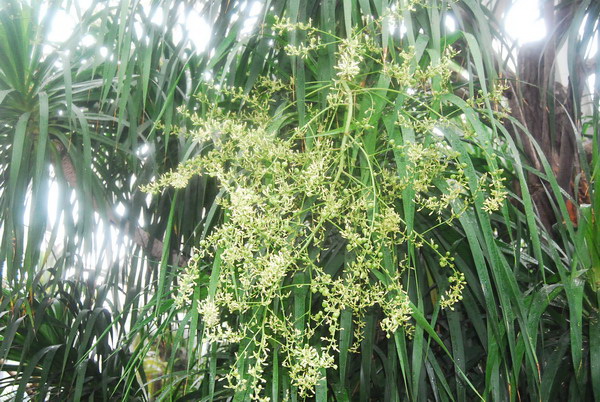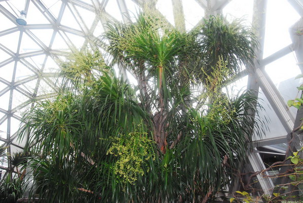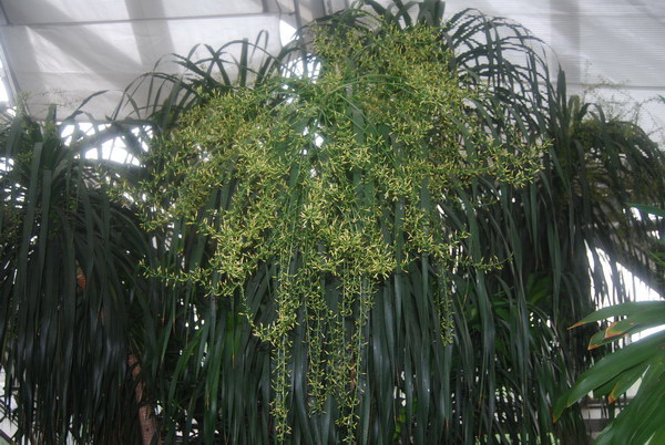 近日,上海辰山植物园(中科院上海辰山植物科研中心)珍奇植物馆内,数珠高大的长花龙血树枝顶绽放出了大型披散的圆锥花序,白色小花密集花枝,芳香迷人,其间还结出了绿色的小圆果,颇有一番趣味。