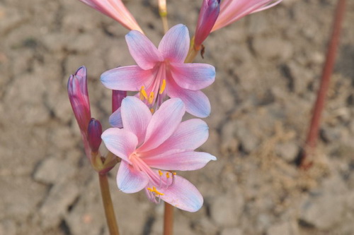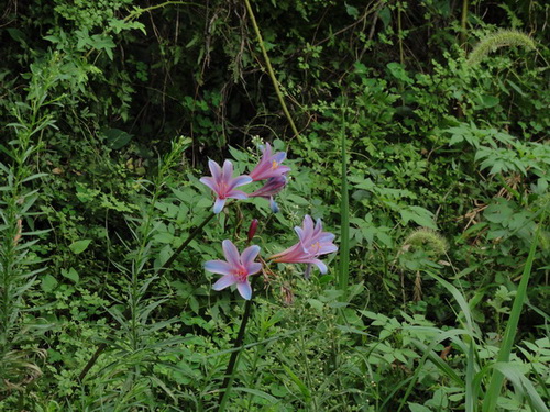 换锦花(Lycoris sprengeri)别名红蓝石蒜、彼岸花,为石蒜科石蒜属的多年生球根草本花卉,具有叶无花、有花无叶的独特景象,性耐寒,喜阴湿环境,早春长叶,叶带状,5-6月枯落;8-9月开花,花葶高达60厘米,总苞片2枚,伞形花序有花4-6朵,花淡紫红色,顶端带蓝色,花柱略伸出花被外。