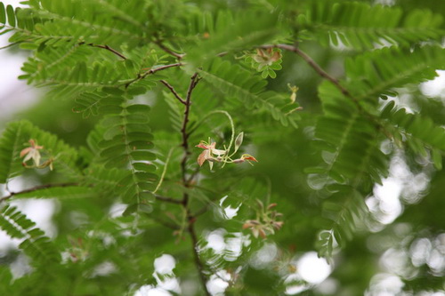 酸豆(Tamarindus indica),别名酸角、酸梅、罗望子。豆科酸角属,常绿高大乔木,偶数羽状复叶互生,小叶10-20对;总状花序生枝顶,花萼狭陀螺形,黄色,檐部4裂,花瓣黄色,杂以紫红色条纹,仅后方3片发育,倒卵形,边缘波状,前方2片退化呈鳞片状,藏于雄蕊管基部;荚果长圆柱形,不开裂,褐棕色,常不规则缢缩。原产非洲,现各热带地区均有栽培。
