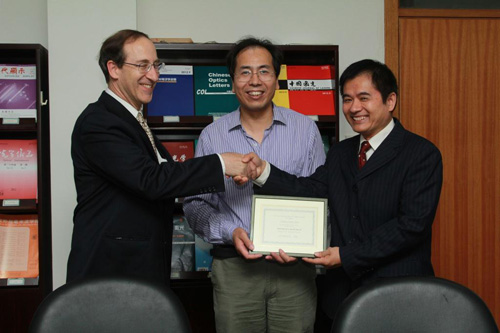 陈卫标副所长(中)与Tony Heinz教授(左)向Photonics Research首任主编周治平教授(右)颁发聘书
