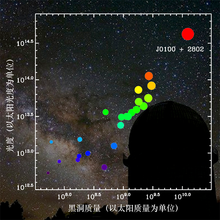 图2:吴学兵等发现的类星体J0100+2802是已知遥远类星体中黑洞质量和光度最大的(图片制作人:李兆聿。背景是丽江2.4米望远镜圆顶及其天空,照片由中国科学院云南天文台提供。 )