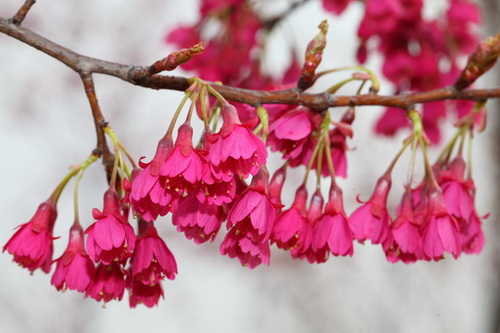 河津樱(Cerasus lannesiana 'Kawazu-zakura')树姿优美呈广卵形,花先叶开放,花蕾红色。1955年在日本静冈县贺茂郡河津町野生状态发现,是寒绯樱和花期较早的大岛樱的自然杂交品种。由于其树形高大、花朵大且花色明艳亮丽、花期早等特性,近年来被广泛栽培,深受人们喜爱。