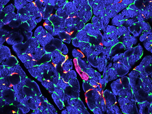 c-Kit CreER(RFP)标记极少量的心肌细胞和部分内皮细胞(红色为RFP,蓝色为心肌细胞,绿色为内皮细胞)