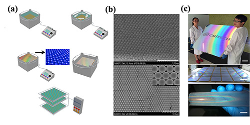 图1 微推注射系统及大面积、高产率制备单分子层周期性聚苯乙烯小球阵列的展示