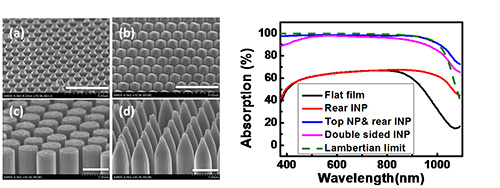 团队首先针对该超薄电池对入射光吸收不充分的突出问题,设计了二维纳米光子晶体绒面来抑制入射光在正表面的反射,并利用光波导效应来增长特征波段光在硅片内部传输的有效光程。为了解决光子晶体制备过程中的阵列结构掩模难题,自主研发了一种新型聚苯乙烯小球(PS)单分子层二维周期掩模制备方法,该方法采用多通道微推注射系统直接在液体表面制备PS小球单层自组装膜,之后转移到预置硅片上。基于该方法,团队率先展示出>1 m2的大面积的PS单层膜样品,并设计出产率>3000片/h(与光伏产业匹配)的全自动微推注射原型装置,真正把实验室层面的PS小球掩模技术向产业化推进了一大步。在高质量PS小球掩模的帮助下,结合完全可规模化生产的湿法腐蚀(酸或碱性腐蚀)技术,团队在20μm厚度薄膜硅衬底上按照设计尺寸成功制备出纳米柱、纳米金字塔(或倒金字塔)、纳米铅笔等特征纳米光子晶体绒面结构,并获得了全波段接近光学吸收极限的陷光效果。上述相关研究已申请中国专利(201510084323.8,201410196870.0,201420239374.4,201410196601.4,201310480369.2),研究成果发表在Nano Letters(2015, 15, 4591)杂志上。