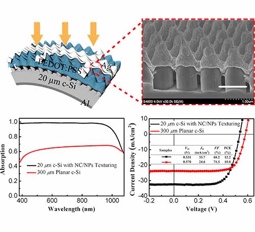 在所制备的各种阵列绒面结构中,纳米铅笔结构具有上端为纳米锥、下端为纳米柱的二元构型,上端的纳米锥结构具有出色的结构渐变特性(阻抗匹配),有助于最大限度地降低入射光的直接反射损失,同时下端的纳米柱结构则有助于增强入射光的散射(增加有效光程)。在仅仅1.5μm的制绒深度下,纳米铅笔结构帮助薄膜硅获得了优异的陷光效果(400-900 nm波段平均反射率小于1.5%)。同时,顶端开口较大的锥状结构有利于导电聚合物PEDOT:PSS对其形成良好的包覆,增大n-Si/PEDOT:PSS异质结电池的结区面积,增进载流子收集效率。该新型纳米绒面结构从一定程度上回应了纳米绒面结构太阳能电池无法同时达到光、电两方面增益的难题,仅由正面结构优化所制备的20μm级杂化太阳能电池光电转换效率超过12%。该方法为通过绒面形貌控制制备高效太阳能电池提供了一种新思路,相关结果被Advanced Energy Materials(2015, DOI: 10.1002/aenm.201501793, In press)杂志接受。