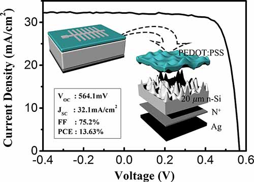 为进一步提升n-Si/PEDOT:PSS异质结电池的光电转换效率,团队着力于抑制电池背面载流子复合。通过在背面引入高掺杂层,形成合适的背表面电场,通过有效降低少数载流子在表面的富集浓度来降低电子-空穴在表面的复合。高掺杂层还有助于降低电子向背电极输运的势垒,同时降低与背电极之间的电阻接触损失。由此,团队在20μm薄膜硅衬底上制得了光电转换效率超过13.6%的n-Si/PEDOT:PSS异质结太阳能电池。这一效率与现有已报道的300μm体硅杂化电池的最高效率相当。该研究为低成本、高效率薄膜异质结太阳能电池器件的发展提供了可行的思路,相关成果发表在ACS Nano(2015, 9, 6522)杂志上。