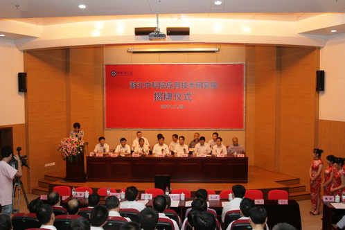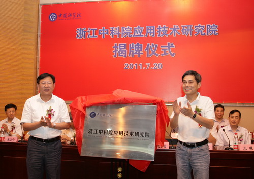 中国科学院和浙江省人民政府7月20日在嘉兴市隆重举行浙江中科院应用技术研究院揭牌仪式,中国科学院副院长施尔畏和浙江省副省长毛光烈共同为研究院揭牌。中科院有关领导杨柏龄、竺玄、田静、孙殿义,中科院上海分院常务副院长朱志远,浙江省政府副秘书长孟刚、省科技厅厅长蒋泰维和省有关部门领导,中科院14家入驻嘉兴的研究所领导,中科院、浙江省和嘉兴市有关方面的领导,俄罗斯科学院西伯利亚分院,有关科研单位和企业家代表等共250多人出席了揭牌仪式。嘉兴市委书记李卫宁致欢迎词,嘉兴市委副书记、市长鲁俊主持揭牌仪式。