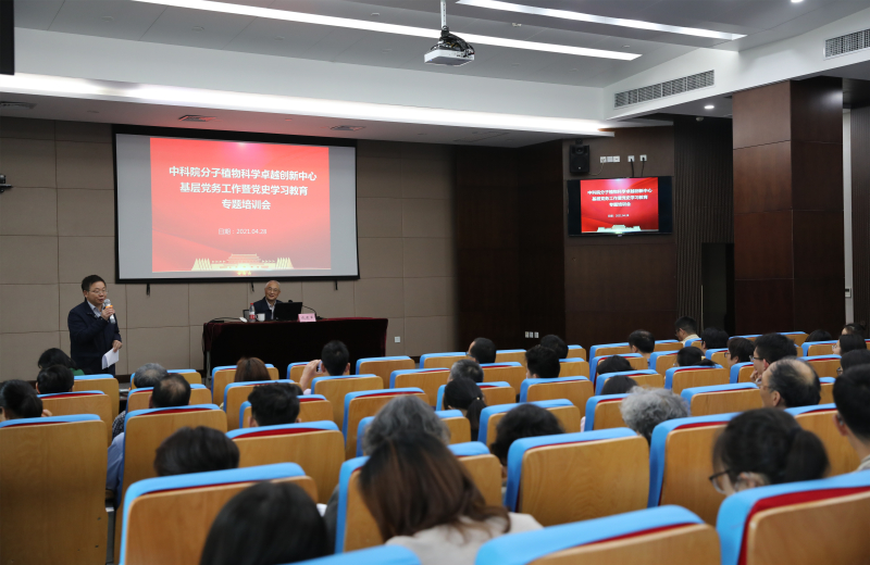 4月28日下午,分子植物卓越中心党委召开基层党务工作暨党史学习教育专题培训会,特别邀请中科院党史学习教育第十五指导组组长、原中科院上海药物所党委书记成建军围绕深入开展党史学习教育,作题为《研究所党建与科技的融合发展》专题辅导报告。中心各党支部书记、副书记、支委委员、党员代表70余人参加了学习。培训会由中心党委副书记(主持工作)、副主任郭金华主持。