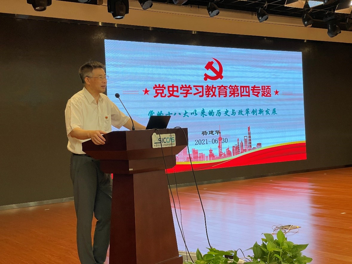 6月30日上午,中国科学院上海硅酸盐研究所特种无机涂层研究中心党支部、结构陶瓷与复合材料工程研究中心党支部、苏研院党支部与中试基地党支部联合开展主题党日活动,活动包括专题学习、集体政治生日仪式、重温入党誓词、初心故事分享和党史知识竞赛,邀请了上海硅酸盐所党委副书记、纪委书记杨建华讲党课。近80余名党员参加了此次活动。