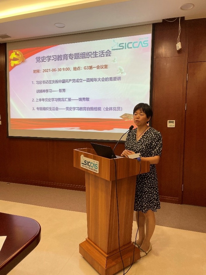 8月23日下午,中国科学院上海硅酸盐研究所结构中心党支部在嘉定园区G3(1)会议室召开党史学习教育专题组织生活会,中国工程院院士董绍明,所党委委员、综合办公室主任彭芳以及20余名党员参加会议。组织生活会由党支部书记姚秀敏主持。