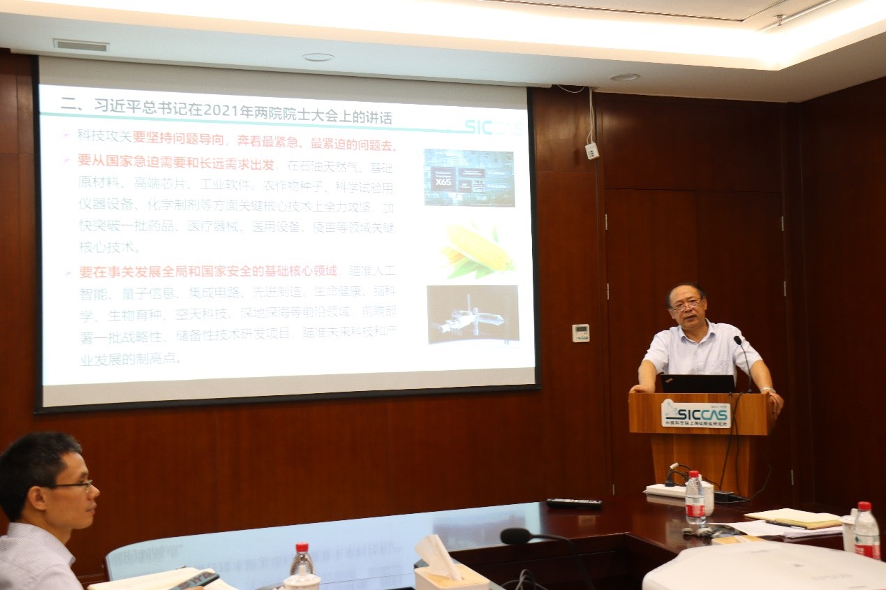 所长宋力昕作题为《深化科研绩效和人才评价改革,加快实现从“在做什么”“能做什么”向“该做什么”转变》的主题报告。他带领大家再次回顾学习了习近平总书记在2021年两院院士大会上的讲话精神,重点分析了科技创新要围绕国家需求开展、国家科研机构要以国家战略需求为导向、要完善项目分类评价制度与人才评价体系等内容。他表示,当前我国科技领域正处于重大转型的历史时期,科研工作评价标准和人才评价标准必须全面改革。他还解读了科技部、发改委、中科院、基金委等部门近期出台的关于基础研究与科技评价相关的重要政策文件。在讲到学习贯彻院党组2021年度夏季扩大会议精神时,他谈到,要准确把握“国家事”“国家责”的内涵和要求,进一步明确研究所使命定位和目标任务;要强化责任担当和使命驱动,加快推进研究所改革创新发展,特别是改革基础研究工作评价标准,解决基础研究和高技术研究两张皮现象。他强调,要进一步学习贯彻习近平总书记“七一”重要讲话精神中关于推进科技自立自强的重要论述,把国家战略需求作为研究所科技创新工作的出发点,把国家重大科技任务作为主攻方向;要加快制定完善研究所“十四五”规划,深入研究在先进无机材料领域要做的“国家事”、要担的“国家责”,加快实现从“在做什么”“能做什么”向“该做什么”转变;要进一步明确基础研究定位,重点解决高技术研究中的科学问题,加强与关键核心技术攻关的贯通促进;要持续完善科技体制机制改革,统筹规划人才队伍、科研组织、科研平台等工作,强化治理体系与能力建设,推动产出更多充分体现国家意志、有效满足国家需求、代表国家最高水平的科技成果,履行好国家战略科技力量的使命与责任,助力我国科技自立自强。
