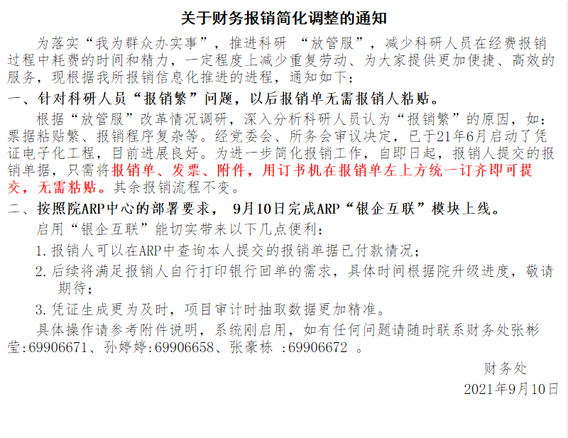 在“帮”字上花功夫,减少科研人员在科研经费报销上花费的精力,“让专业的人做专业的事”,解放科研人员、释放创新活力。针对科研人员报销时粘贴票据工作量大,粘贴不规范引起的“报销烦”问题, 9月10日发布全所通知,即日起,报销单无需报销人粘贴,只需用订书机简单装订,后续由财务部门结合凭证电子化进行专业化装订归档。该举措实施以来,共接受报销单2372份,全部免于粘贴,报销人员反馈该举措实实在在减轻了他们报销时的工作量,节约了报销花费时间。研究所资产管理处负责代理全所的设备采购、材料采购、加工、测试等报销,相关管理人员对此感触颇深,据其中一位老师反映“再也不用胶水粘贴,我轻松了很多”。