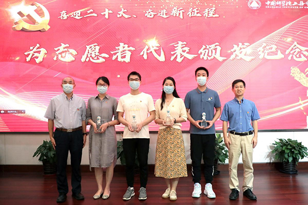 为感谢全体志愿者在有机所疫情防控中所作出的无私奉献和辛勤付出,有机所为200余名志愿者定制“抗疫先锋”、“志愿标兵”、“抗疫卫士”纪念奖杯。唐勇代表有机所党政领导班子为四位志愿者代表颁发纪念奖杯。