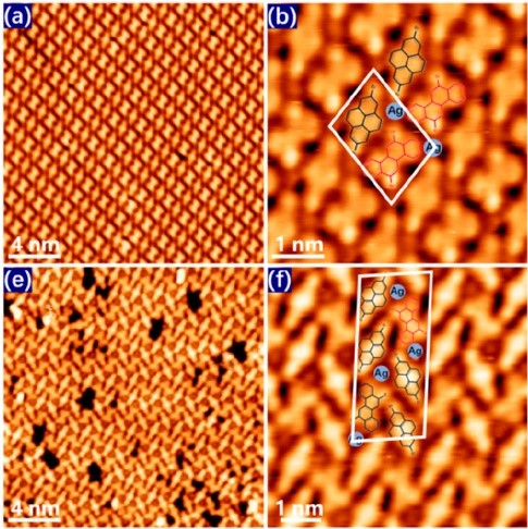 图1. 两种不同的前驱体在Ag(111)上的可控自组装(上图1:1摩尔比, 下图1:2摩尔比)
