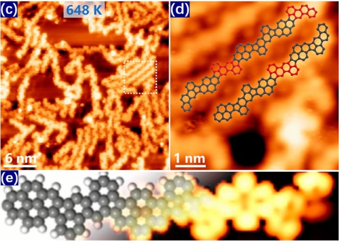 具有锯齿形状和沙发扶手型边缘结构的石墨烯纳米带(GNRs)具有十分优异的性质,特别是内在电子结构的高度可调性,使得其在物理、化学和材料科学等领域引起了广泛的研究关注。除了通过控制条带宽度和边缘结构来实现GNRs能带调控以及电子学性质调控以外,通过自下而上的表面合成法在GNRs中植入周期性的非六元环结构,可为人工调控GNRs的物理结构和电子学特性提供一种全新的研究方法。