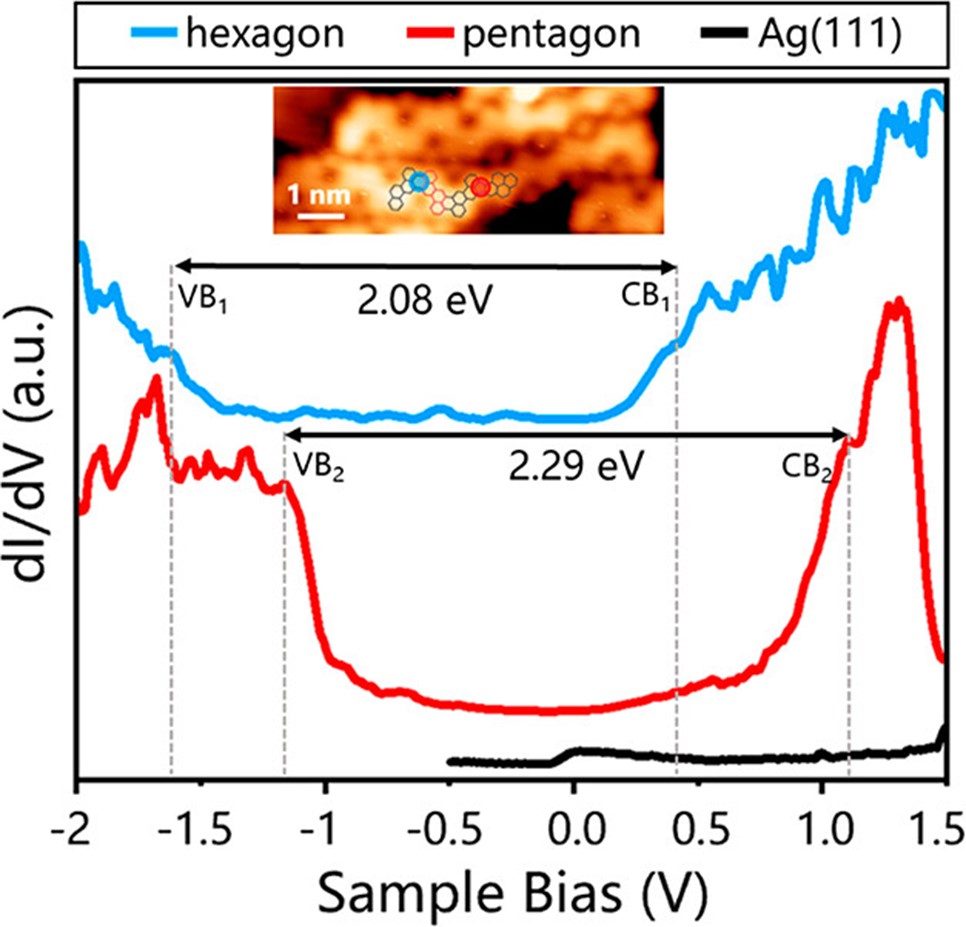 随后,可控的程序升温逐层级诱发C-Br的断裂,形成基于不同前驱体的C-Ag有机金属中间体以及最后双前驱体熔合后得到的五元环嵌入的异构型六元环结构(图2)。结合扫描隧道显微谱、隧道谱以及密度泛函理论计算,证实了五元环的引入对石墨烯纳米带内在能隙以及电子态密度的人为调制(图3)。进一步地,结合DFT计算等,解释了空间位阻效应对于非平面与平面型纳米石墨烯带进一步脱氢环化反应温度的影响(以及前期工作 Nanoscale Adv. 2023, 5, 1368),以及Ag(111)表面增原子在克服脱氢环化过程中高反应势垒所起到的关键作用。本项研究工作为利用金属衬底表面异构化合成新颖的石墨烯纳米结构提供了新思路,相关方法也可以扩展到其它碳基纳米材料的制备上。