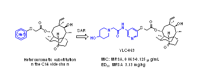 中科院上海药物研究所杨玉社课题组以Nabriva公司在研药物BC-7013为先导化合物,设计合成了一系列芳杂环取代的新型截短侧耳素衍生物。通过深入的构效关系研究、构代关系研究以及成药性优化,发现了化合物YLC-063。YLC-063大鼠体内代谢性质较好,静脉给药后在MSSA感染小鼠模型中表现出和利奈唑胺相当的药体内抗菌作用,而在MRSA感染小鼠模型中的体内抗菌作用则明显优于利奈唑胺,值得进一步研究。