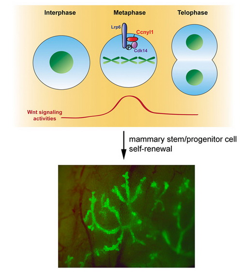 图示:在乳腺干细胞(或前体细胞)自我更新过程中,周期蛋白Ccny和Ccnyl1特异性地高表达于细胞分裂期,通过结合Cdk14而磷酸化Lrp6 Ser1490等位点。这种调控方式增强了分裂期的Wnt信号通路活性,对乳腺干细胞(或前体细胞)的干性维持以及乳腺形态发生起到了关键性作用。