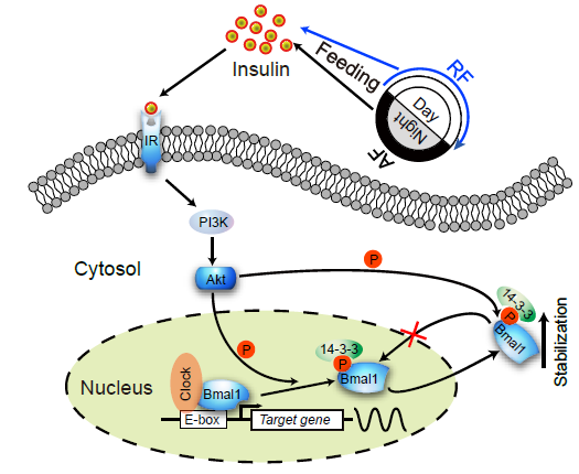 在刘浥研究员的指导下,博士生党法斌、孙秀杰等通过研究发现:在进食状态下,由胰腺分泌的胰岛素能够通过肝细胞表面的胰岛素受体,将信号传递至细胞内,激活 PI3K-AKT2 信号通路,激活的 AKT2 能够磷酸化 Bmal1-Ser42,被磷酸化的 Bmal1 与 14-3-3 结合,进而将 Bmal1 稳定在细胞质中,从而抑制 Bmal1/Clock 下游基因的表达。通过食物牵引试验(food entrainment)改变小鼠正常的饮食节律发现,:一方面胰岛素分泌的节律会随之改变,导致 Bmal1 在细胞核内的聚集模式发生变化,Dbp, Rev-erbα 等下游节律基因的表达相位被逆转,表明肝脏生物钟的节律被重置;另一方面,小鼠通过增加饮食来储存食物,导致胰岛素分泌剧增,致使胰岛β-细胞遭受巨大的压力,这可能是造成胰岛β-细胞在饮食牵引状态下功能丧失的原因之一。这些发现不仅揭示了作为一种重要的进食信号,胰岛素调节肝脏生物钟发生的分子机制,也为理解不规律饮食与生物钟紊乱,及代谢综合征的发生之间的关系提供了新的启示。