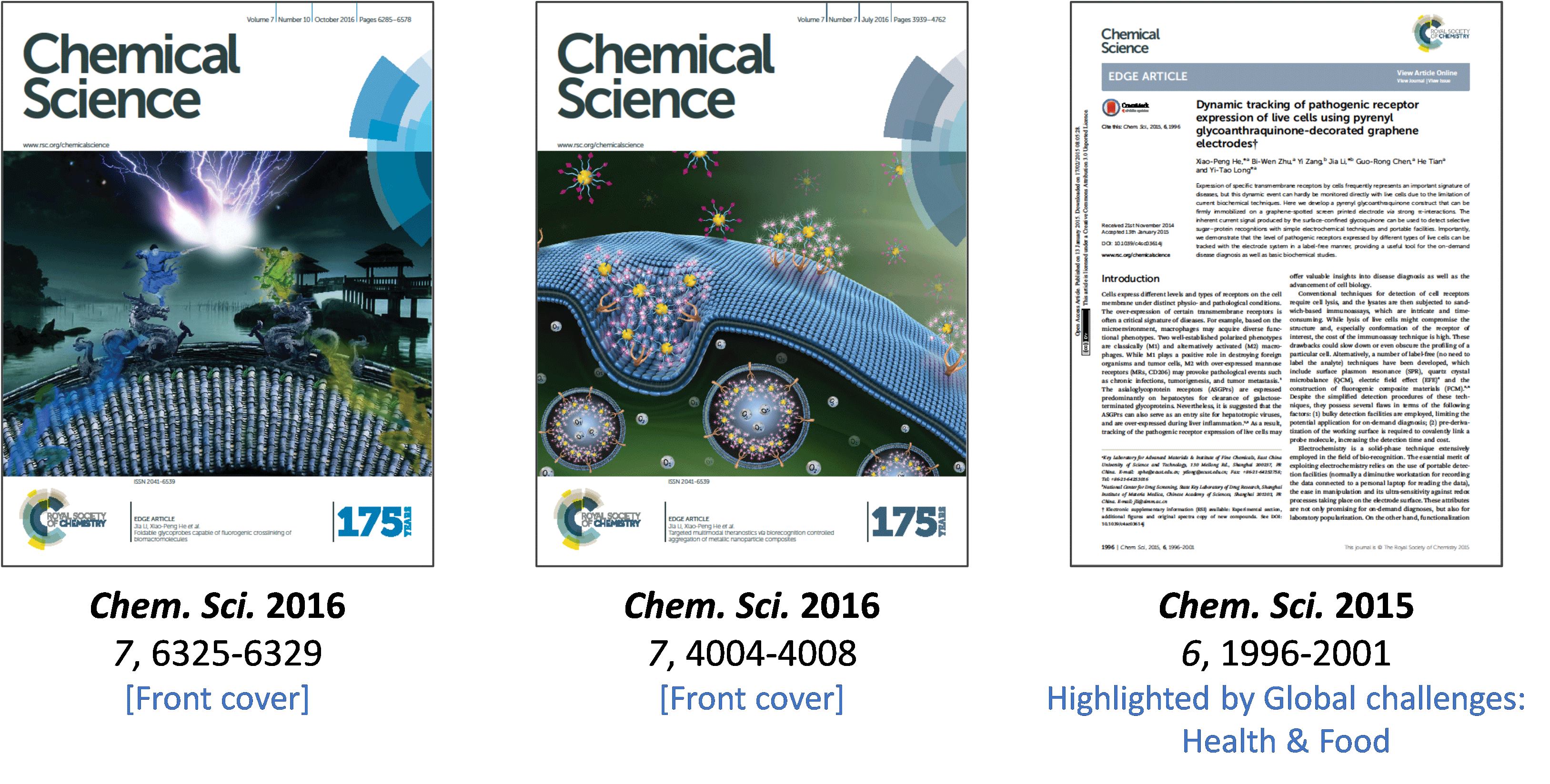 此外,李佳课题组先前发表于《化学科学》的糖基石墨烯诊断(Chem. Sci. 2015, 6, 1996)与糖基金纳米颗粒诊疗(Chem. Sci. 2016, 7, 4004)工作被刊物中的专栏“Global Challenges: Health & Food”亮点介绍,此专栏旨在介绍国际学术界应对全球健康与食品重大挑战性问题的优秀工作。