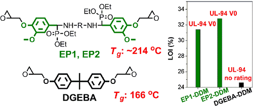 图1 香草醛基高性能阻燃环氧结构及与双酚A环氧的性能对比
