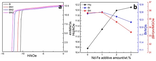 本实验室通过引入低熔点Nd-Fe合金粉末,采用晶界添加的方式控制稀土Nd元素分布于磁体晶界处,三角晶界处所形成的相经选区电子衍射标定(如图1),表明形成的为RE6Fe13Cu1相,而与初始Ce基磁体存在于三角晶界处的REFe2相相比,新形成的相具有更低的熔化温度(702K),因而在对磁体进行回火热处理时,晶界处流动性更强更易于在主相晶粒间形成薄层晶界,短程去磁耦合作用更为明显。对主相晶粒边缘与中心处元素分析结果(如图2)表明,由于存在浓度梯度差异,控制Nd在晶界处分布会使得晶粒边缘处Nd含量高于晶粒中心处,从而在晶粒表层形成类似重稀土元素扩散磁体中常见的核壳结构,有利于修理晶粒表层缺陷,提高主相晶粒各向异性场,最终制备得到矫顽力Hcj=12.7kOe,剩磁12.21kGs的Ce基稀土永磁体(如图3),相关工作已申请发明专利(CN 201610901011.6),并发表于AIP Advances(DOI: 10.1063/1.4976722)。