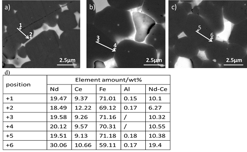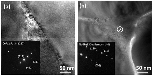 稀土2:14:1型永磁体因其高矫顽力、高剩磁及高磁能积的特点,被广泛应用于电子通讯、交通运输、军事装备等领域,并在国民的生产生活中扮演着越发重要的角色,被冠以磁王的称号。近几年来,出于对稀土资源综合利用和降低稀土永磁企业生产成本的角度考量,对于高丰度稀土元素Ce的应用越发引人关注,但高丰度Ce基磁体因其主相内禀磁性能低,微观结构差,综合磁性能普遍不尽如人意。宁波材料所稀土磁性功能材料实验室通过晶界调控的方式在制备高性能高丰度稀土基永磁体的工作中取得了进展。