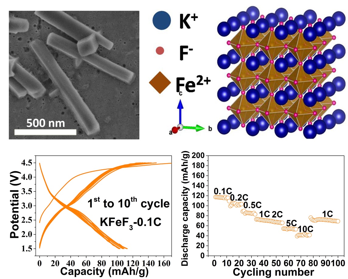 立方钙钛矿是近年来太阳能电池、燃料电池和电催化的研究热点,但之前由于其密结构特点很少被尝试用作储能电极。事实上,健壮构架的钙钛矿相具有本征的三维扩散通道,但是以前报道的NaFeF3中的Na填充通道较窄,导致Fe-F八面体晶格扭曲,使某些方向的通道变得更窄,影响其储钠高倍率的实现。为了实现钙钛矿相的规整化和开框架化,该团队提出用等摩尔数的K+取代Na+作为通道填充剂,通过液相方法合成了一种立方相的KFeF3。KFeF3作为3V区间正极,实现了晶体结构的高度对称性和各向同性的三维快速离子通道,其表现出固溶反应(近零应力)的电化学行为和高的本征扩散系数(7.9–9.8 × 10?11 cm2 s?1),从而使可逆储钠容量在0.1、2和 10 C下分别可达110、 70和 40 mAh g?1,这也是目前所报道的氟化物储钠的最高倍率性能。同时,该团队首次将这一氟化物作为钾离子电池正极材料进行测试,在0.5 C下有60mAh/g的稳定放电容量。