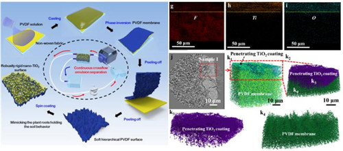 2)具有超稳定刚性浸润表面的柔性PVDF油水分离膜。针对通常聚合物微孔膜的表面微纳结构不稳定、在化学腐蚀及物理损伤下易蠕变及衰减的问题,通过仿生植物根系固定土壤模型,利用微孔PVDF膜表面的微纳结构限域固定TiO2纳米粒子,制备了具有刚性界面TiO2界面的柔性PVDF微孔膜。所得膜具有优异的稳定性,能够抵抗极端物理损伤(液压、手指擦拭、液氮淬火后砂纸磨擦)、高温和苛刻的化学腐蚀(强酸、强碱、强氧化剂次氯酸钠),并且能够连续有效分离含有表面活性剂的油包水乳液。在错流模式下,通过负载超亲水纳米TiO2粒子制备的PVDF膜,可实现水包油乳液的连续分离(通量达1700