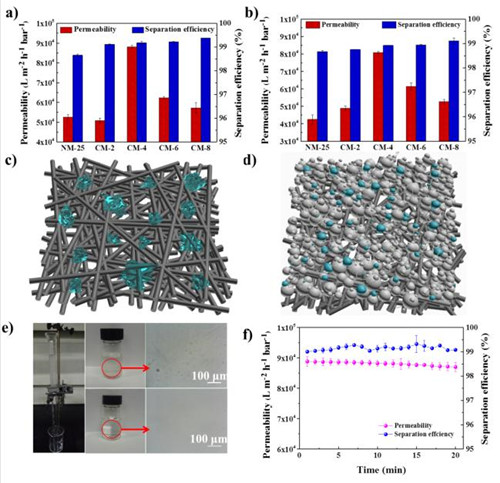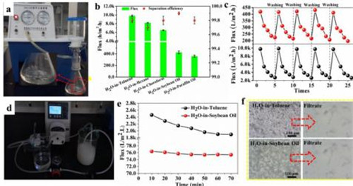 (分离效率>99%),远高于已报道数据。该方法制备过程简单,无需复杂的表面改性过程,是一种适宜工业化生产的新方法。相关工作已经发表在Journal of Materials Chemistry A, 2018, 6, 7014-7020。浙江理工大学的吴金丹博士和硕士生丁雅杰是论文的共同第一作者,王建强副研究员、浙江理工大学王际平教授和刘富研究员为该工作的共同通讯作者。