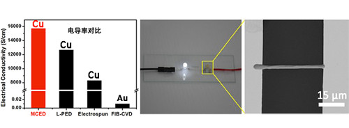 通过横向MCED直写制备的铜微米线具有纳米晶结构,具有超高导电率(15700S/cm),远优于通过传统方法如FIB-CVD或静电纺丝等制备的金属线。基于其优良性能,研究人员将制备的铜微米线用作连接线稳定驱动LED灯,开发了横竖向相结合的三维风速传感器演示器件,如图3所示。