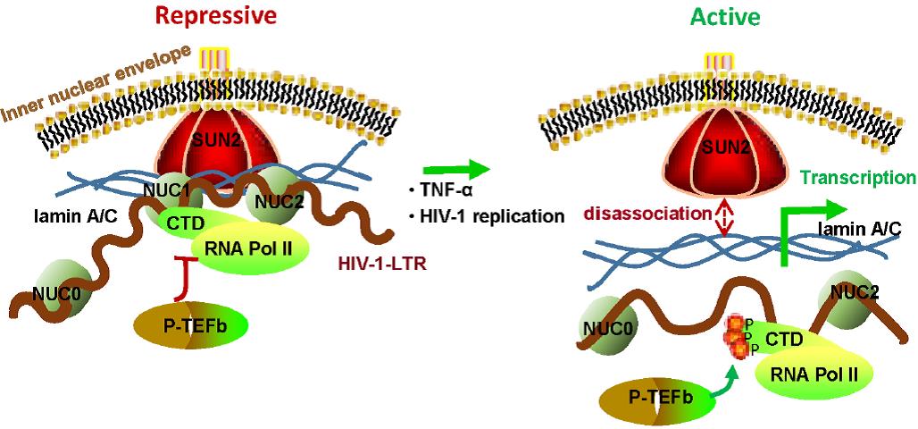图例说明:Lamin A/C把SUN2锚定至LTR Nuc和Nuc-2 区域,维持LTR区域抑制性染色质特性,阻止转录因子至LTR的招募,抑制LTR驱动的HIV前病毒基因的转录,维持HIV的潜伏;潜伏HIV的激活或HIV的感染可使SUN2和Lamin A/C结合解离,增强转录因子至LTR的招募,启动LTR驱动的HIV转录。