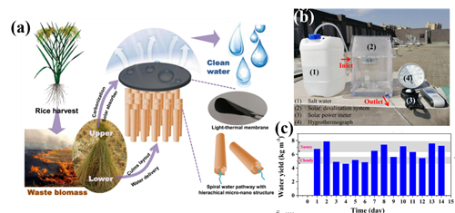 近日,中国科学院宁波材料技术与工程研究所刘富研究员团队在前期光热材料多介质纯化应用研究的基础上(J. Mater. Chem. A 2019, 7, 586-593),发展了一种低成本的全生物质光热蒸馏器,并实现了从多种含水介质中提取纯水(如图1)。基于水稻秸秆生物质,通过限氧裂解方法得到多孔碳基光吸收材料,并与细菌纤维素复合制得高稳定性、高机械强度的光热蒸发膜,太阳光吸收达89.4%。同时利用秸秆生物质的空腔结构作为汲水通道和支撑体来构筑界面蒸发系统,水稻秸秆独特的毛细内腔和壁面多级微纳结构赋予该原生通道优异的无障碍供水能力。由光热蒸发膜和汲水通道组装成的全生物质光热蒸馏器,用于模拟海水淡化装置进行连续室外运行,在晴天和多云天气下日产水量分别为6.4~7.9kgm-2和4.6~5.6kgm-2,且直接达到饮用标准(盐离子去除率保持在99.9%以上)。除了适用于海水淡化,该生物质光热蒸馏器还可从滩涂、湿地、沼泽等含水介质中稳定提取纯净水,展现出良好的普适性。相关工作发表在ACS Appl. Mater. Interfaces. 2019, DOI: 10.1021/acsami.9b00291,该工作得到阿卜杜拉国王科技大学Peng Wang教授的合作支持。