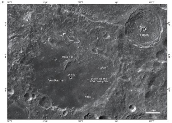 对覆盖着陆区域的高分辨率遥感图像数据和高光谱数据的分析结果显示,着陆器和月球车位于玄武岩“平原”的撞击溅射物上,这些溅射物来自东北方向的芬森(FINSEN)撞击坑,如下图所示。40多亿年前SPA盆地形成时已将月壳减薄或完全剥离。FINSEN坑是由小天体撞击SPA盆地内部表面而形成,其犹如在SPA表面打的一口“深钻”一般,进一步将SPA盆地表面以下月球更深部物质挖掘出,产生的溅射物四处抛射,呈辐射线撒布在冯卡门撞击坑“平原”上。因此,CE-4 VNIS分析到的对象是FINSEN撞击坑挖掘、抛射到冯·卡门撞击坑表面的月幔物质。