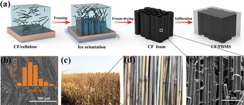 图1 (a) 复合材料制备流程示意图,(b) CF的SEM图及尺寸分布图, (c-d) 芦苇丛图片,(e) CF foam的微观形貌图。