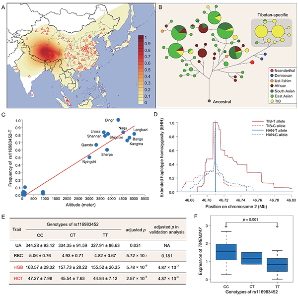 图:藏族人群适应性变异TMEM247-rs116983452-T的群体遗传解析和功能统计学分析