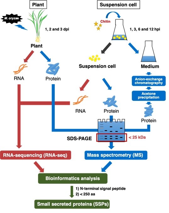 Yoji Kawano研究组和刘仁义研究组设计了一个将转录组学和蛋白组学结合的方法,利用水稻植株和悬浮细胞两个体系,筛选能被稻瘟病菌Magnaporthe. oryzae (M. oryzae) 侵染和几丁质处理而诱导的植物细胞因子的前体蛋白质和小分泌蛋白质(SSPs)。通过RNA-seq共鉴定得到2454个基因,并且利用质谱鉴定到3327个蛋白质被稻瘟病菌和几丁质所激活。最后,筛选鉴定得到236个小分泌蛋白质,包括两个已知的植物细胞因子家族,快速碱化因子(RALFs)和植物磺肽素(PSKs),以及许多免疫相关的蛋白质家族,比如蛋白酶抑制剂(PIs)和发病机理相关蛋白家族(PRs)。其中一个命名为免疫应答肽(IRP)的新基因,它可能编码一个植物细胞因子。细菌肽聚糖和几丁质处理能够诱导IRP的表达并且几丁质可以诱导IRP分泌到水稻细胞外。在过表达IRP的水稻悬浮细胞中,抗病相关基因PAL1表达被激活。另外,与野生型相比,分裂素激活蛋白激酶(MAPKs)的活性在过表达IRP的水稻悬浮细胞中增强,表明IRP在水稻免疫中起着积极的作用。